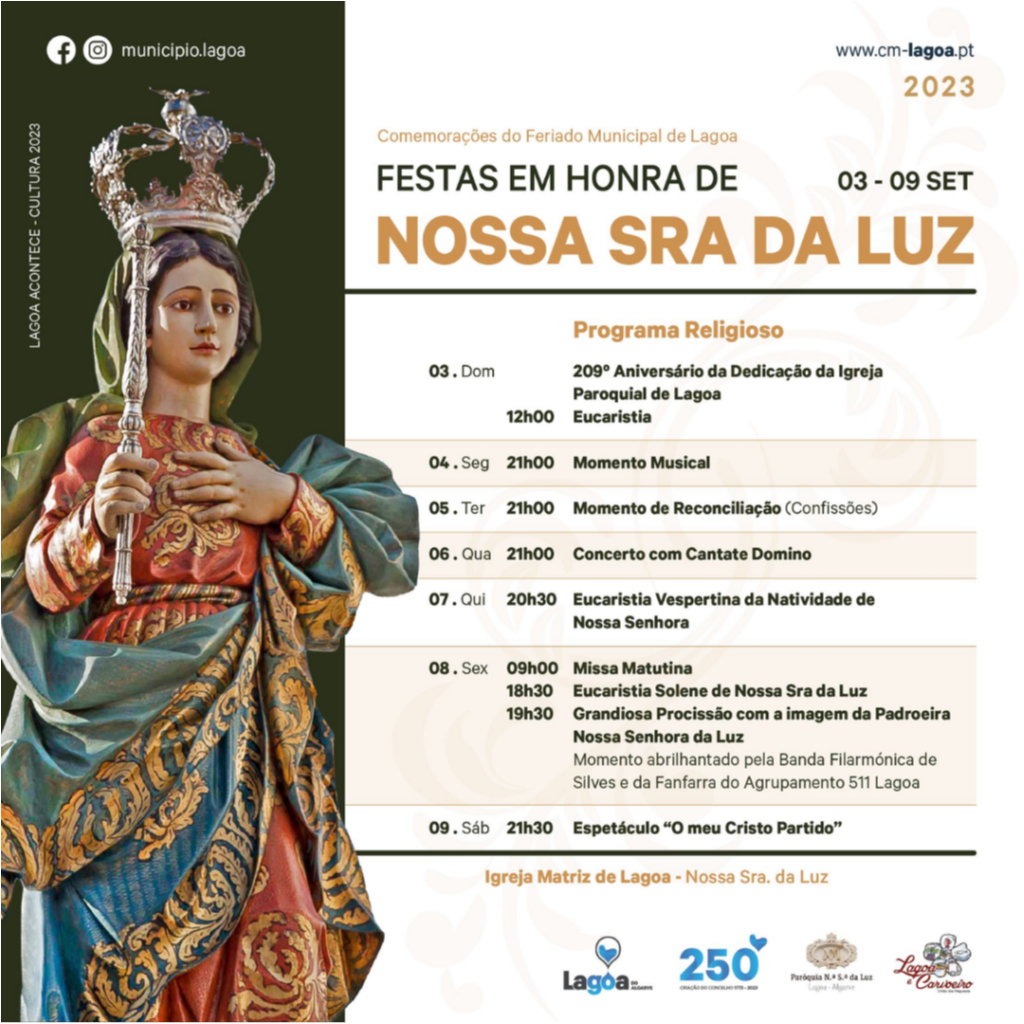 - 19h30 - Grandiosa Procissão da Padroeira Nossa Senhora da Luz, abrilhantada pela Banda Filarmônica de Silves e Fanfarra Agrupamento 511 Lagoa